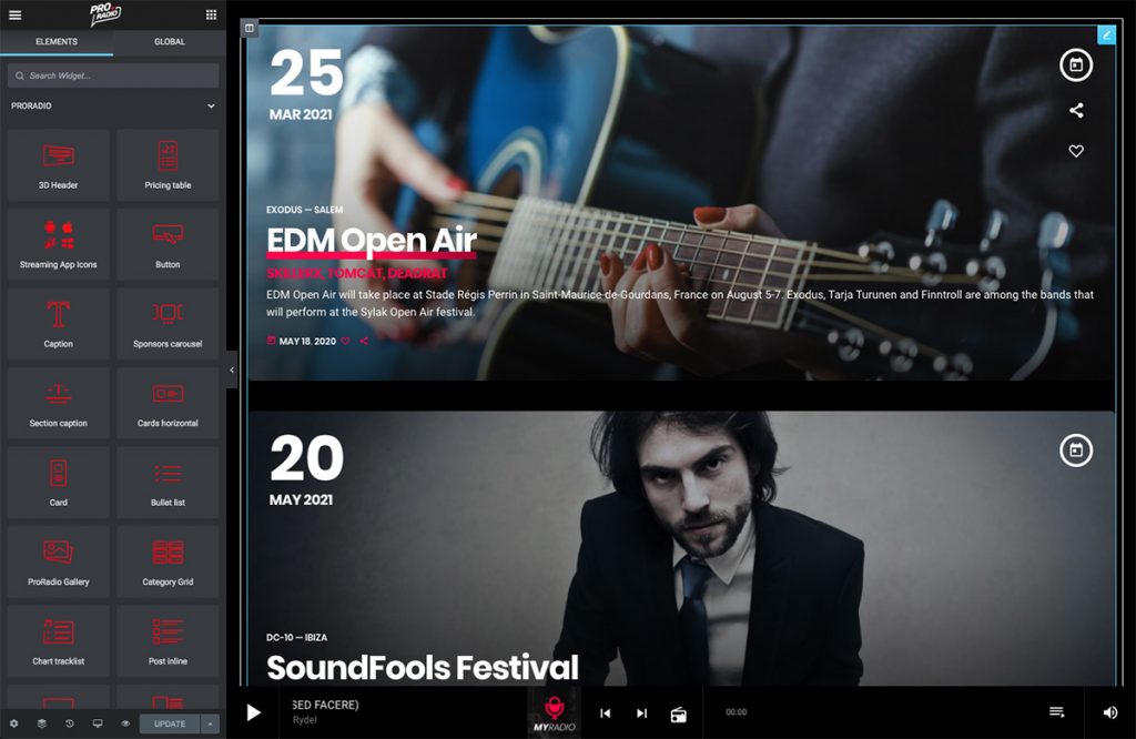 Events are part of almost every radio station website, so ProRadio includes a custom posty type and specific Elementor widget to display them. You can show the next upcoming events and hide the past ones automatically, or set a list of selected events to show.