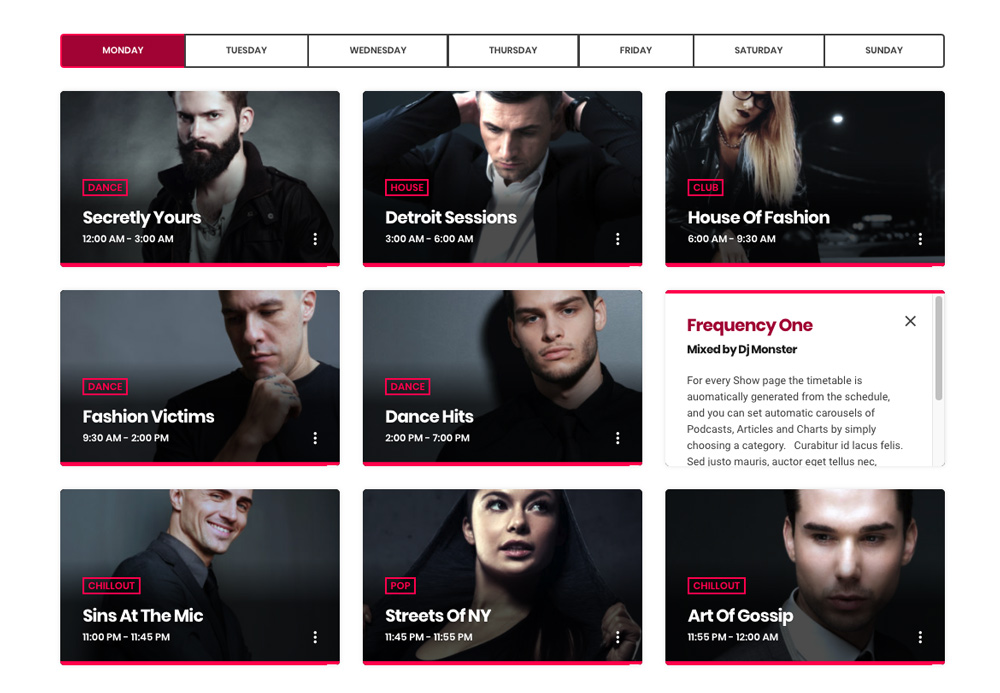The shows schedule is crucial for every radio station, it allows your listeners to tune in when their favorite show goes on air. With Pro Radio you can create multiple weekly schedules and easily display them with Elementor. If you host multiple radio channels, you can filter the schedule by radio, displaying different multiple schedules for each channel in the same page or separate ones.