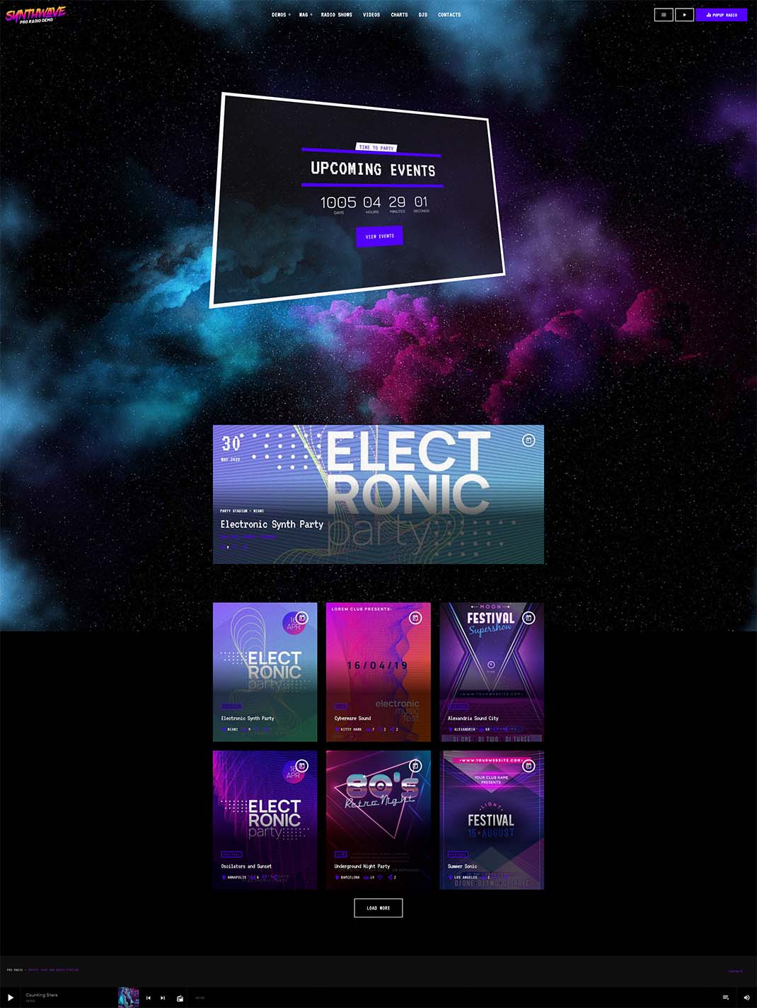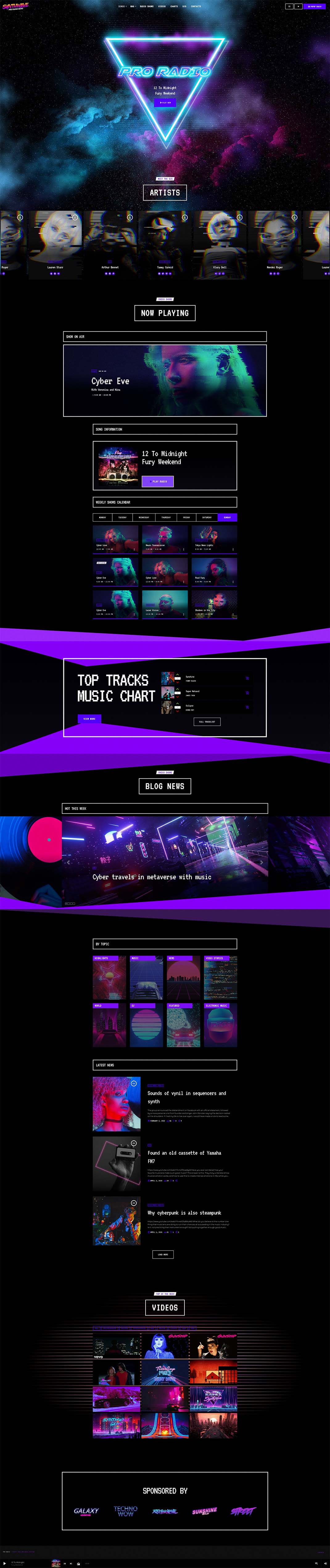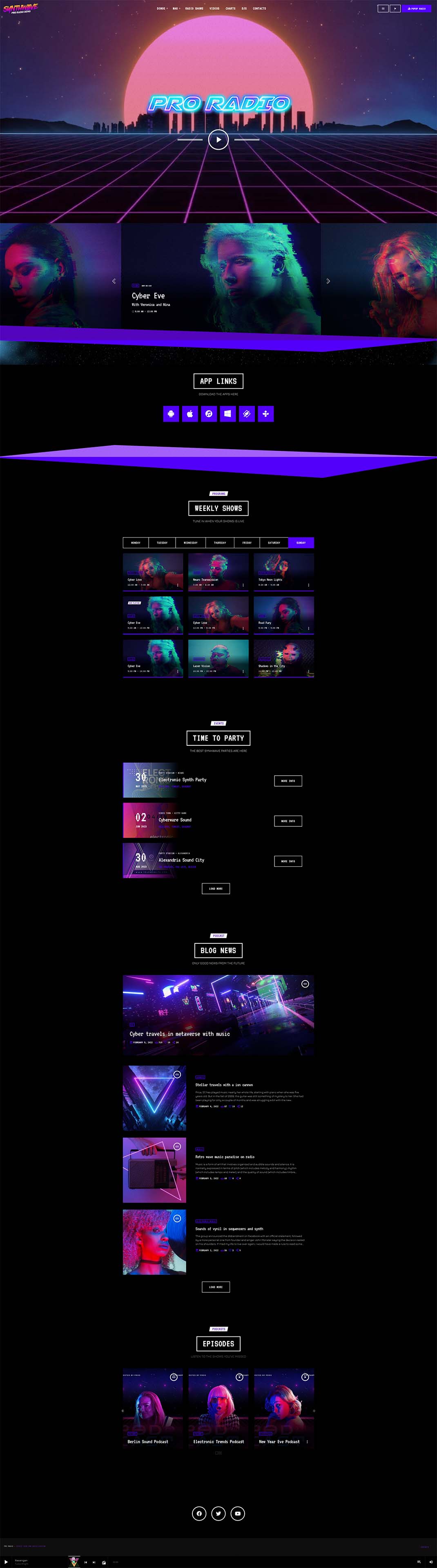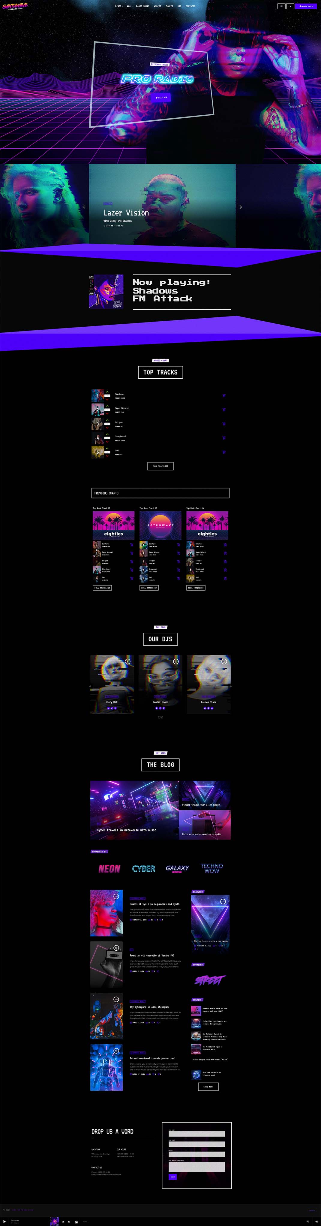 This amazing synthwave and retrovave demo has 10+ home page templates included for Elementor, and unique styling pages. Perfect for your retrowave and synthwave radio station, plus includes the PSD tempaltes in our Radio Pack download area, to make your own featured images in the same style as the demo pictures, completely for free!