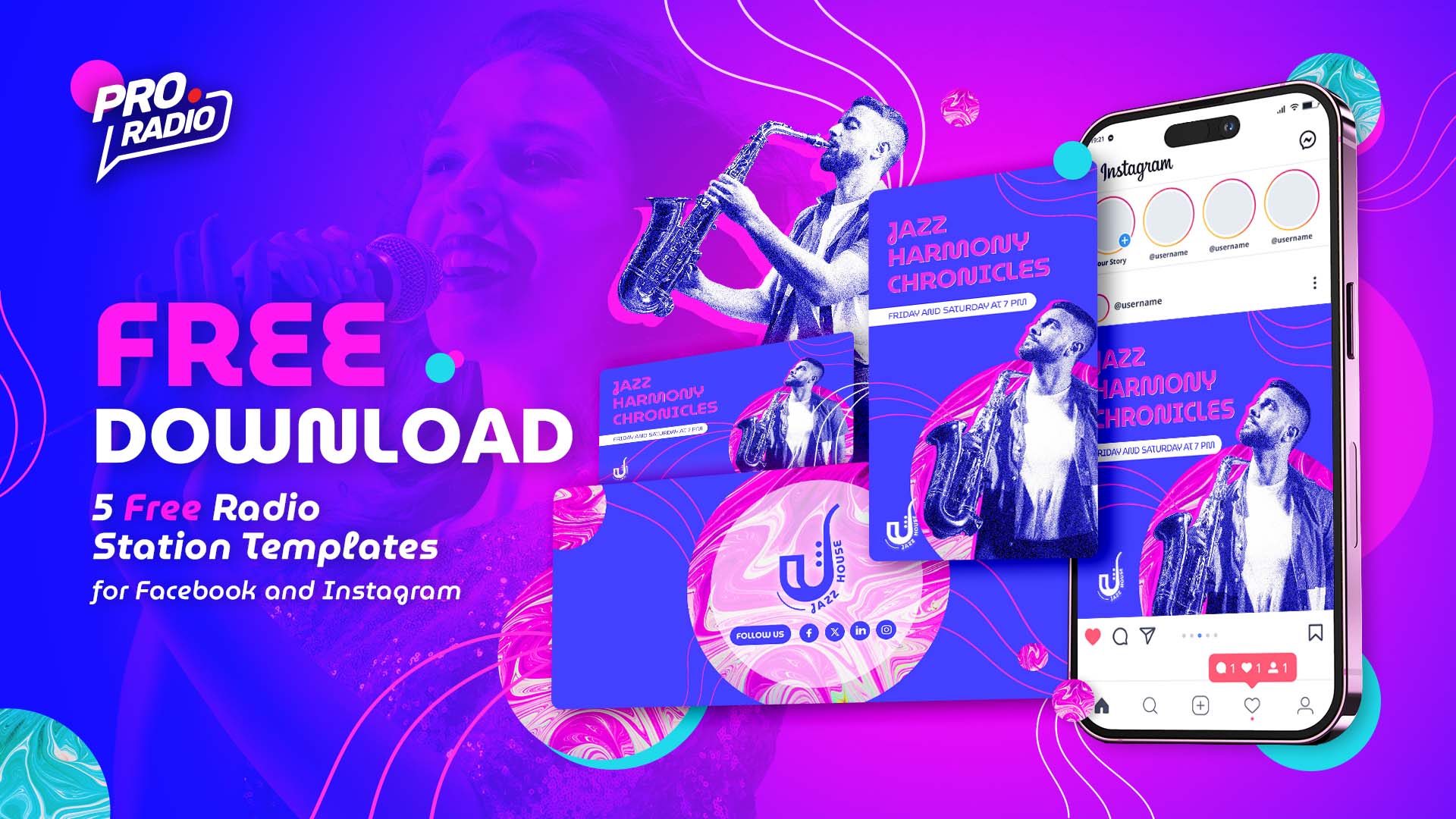 Are you starting a Jazz radio station? Create a successful brand image for your socials: with these new free templates. You can easily achieve a professional radio station Facebook and Instagram page, promote your radio shows, and attract new listeners!