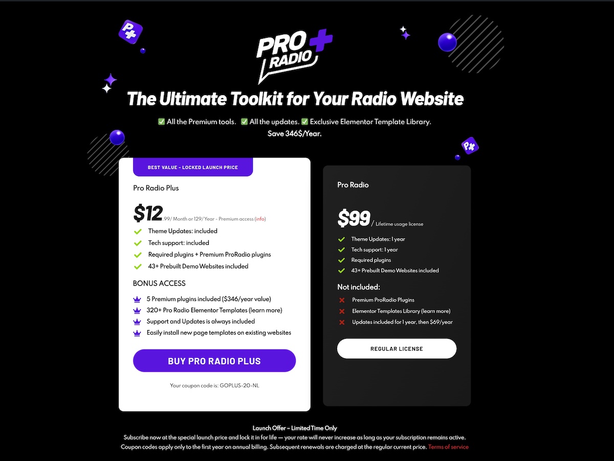 With Pro Radio Plus you unlock all premium add-ons + updates + the full templates library in one simple plan — and save money every year.