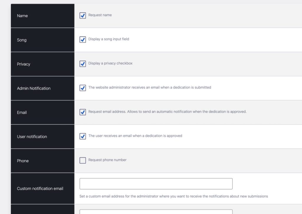 The Premium version of our radio dedications plugin has several advanced options to boost the user engagement, streamline the website management, approvals process and antispam options.