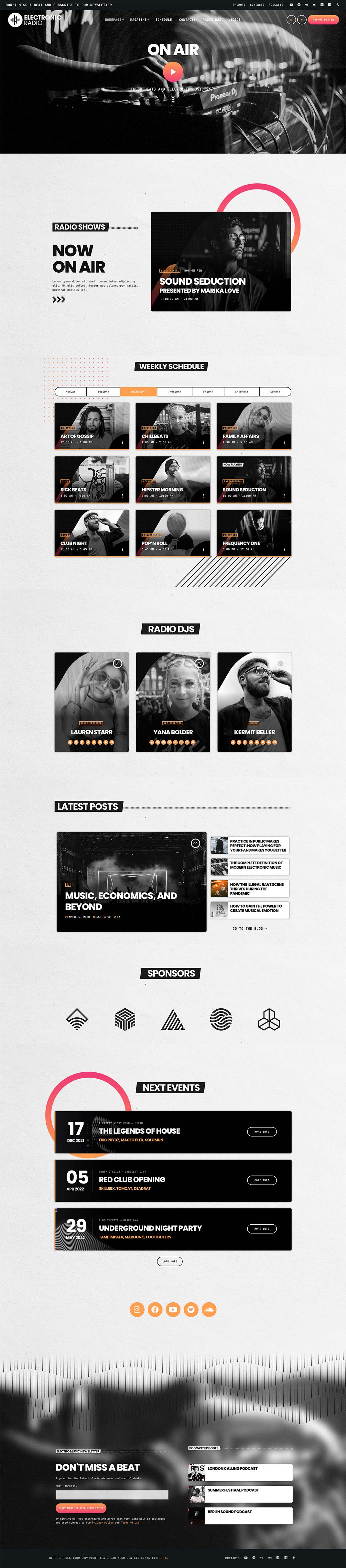 The demo 3 has a unique stylish design dedicated to electronic music radios, with a fresh color combination and lots of pre-built elements that you can modify and reuse for youra radio website. Perfect for Electro, Techno, Drum’n Bass ad more!