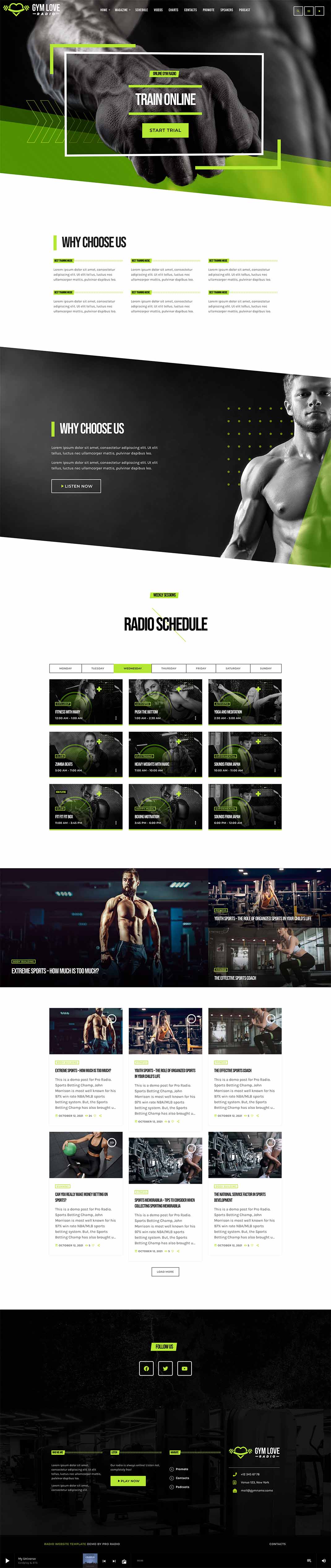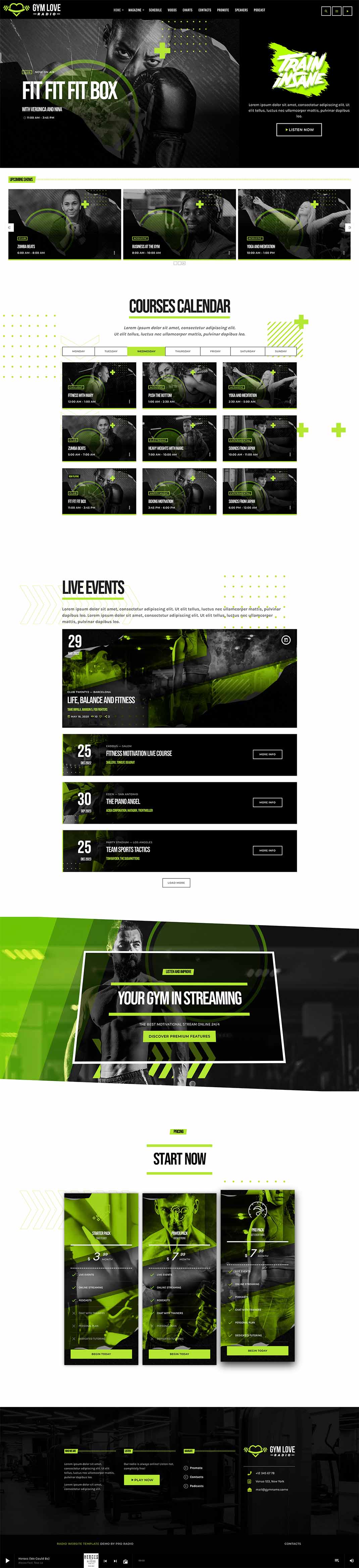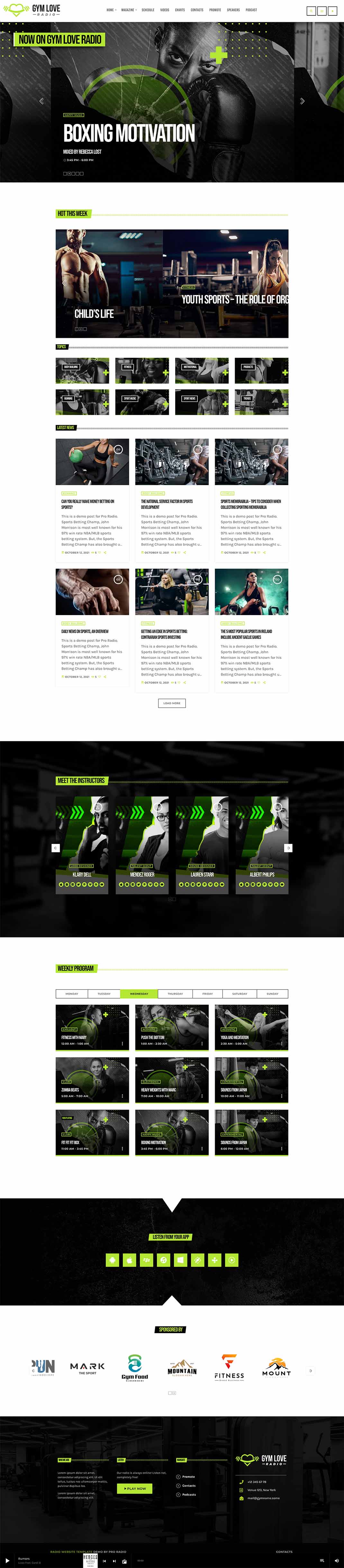 This new amazing demo template included with Pro Radio WordPress Theme is perfect for a Gym, sport or training radio:the schedule and team member features are perfect to fit a weekly programming. You are free to create unlimited schedules, match them with trainers, classes or teachers. The multi-channel player for the radio can be set to play distintive music genres for the different gym activities. This new demo is included witht the Pro Radio theme, can be imported in one click and can be edited visually using Elementor, without a single line of code.