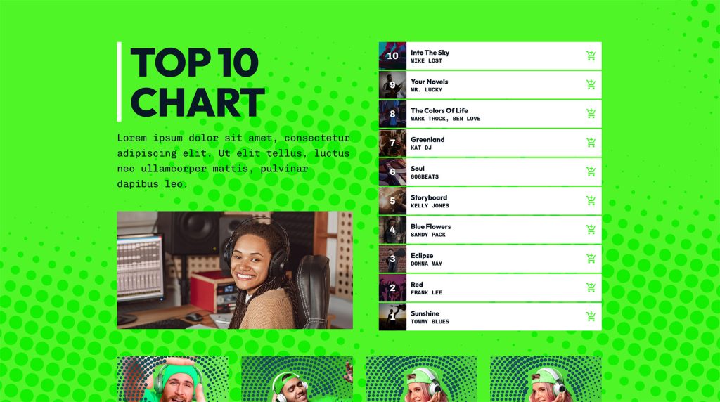 From the moment you land on the homepage, it’s clear that We Wave FM isn’t following trends — it’s setting them. The electric green palette, punchy halftone decorations, and sharp typography built with Outfit and Chivo Mono come together to create a visual identity that feels alive.