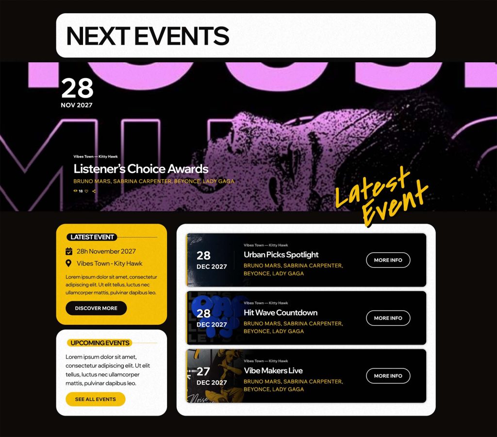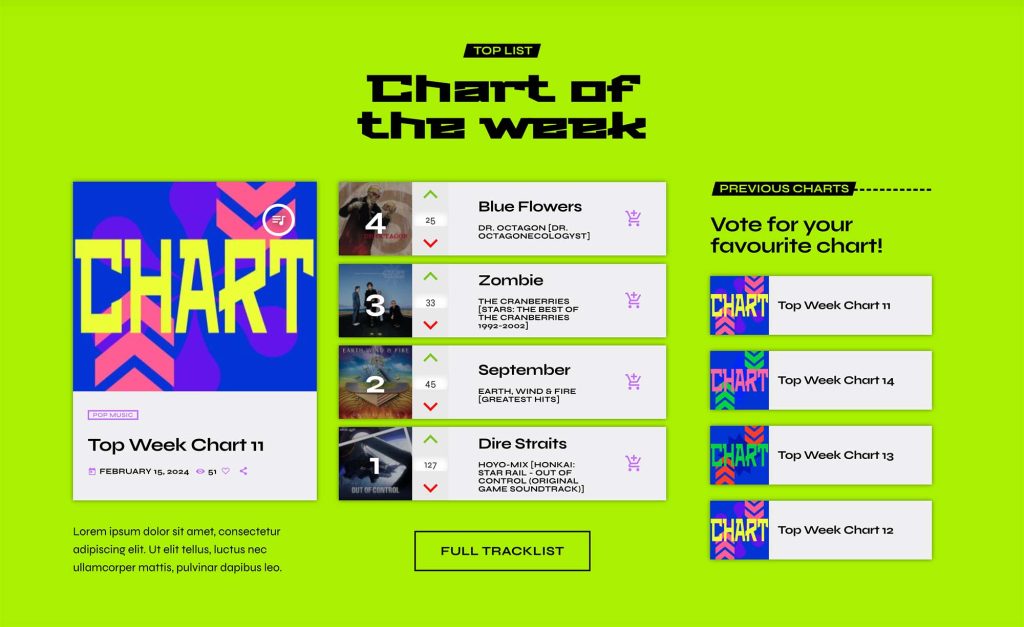 • Music Charts & Featured Tracks: Showcase trending songs, featured artists, and the hottest beats with sleek, interactive music charts and playlists.