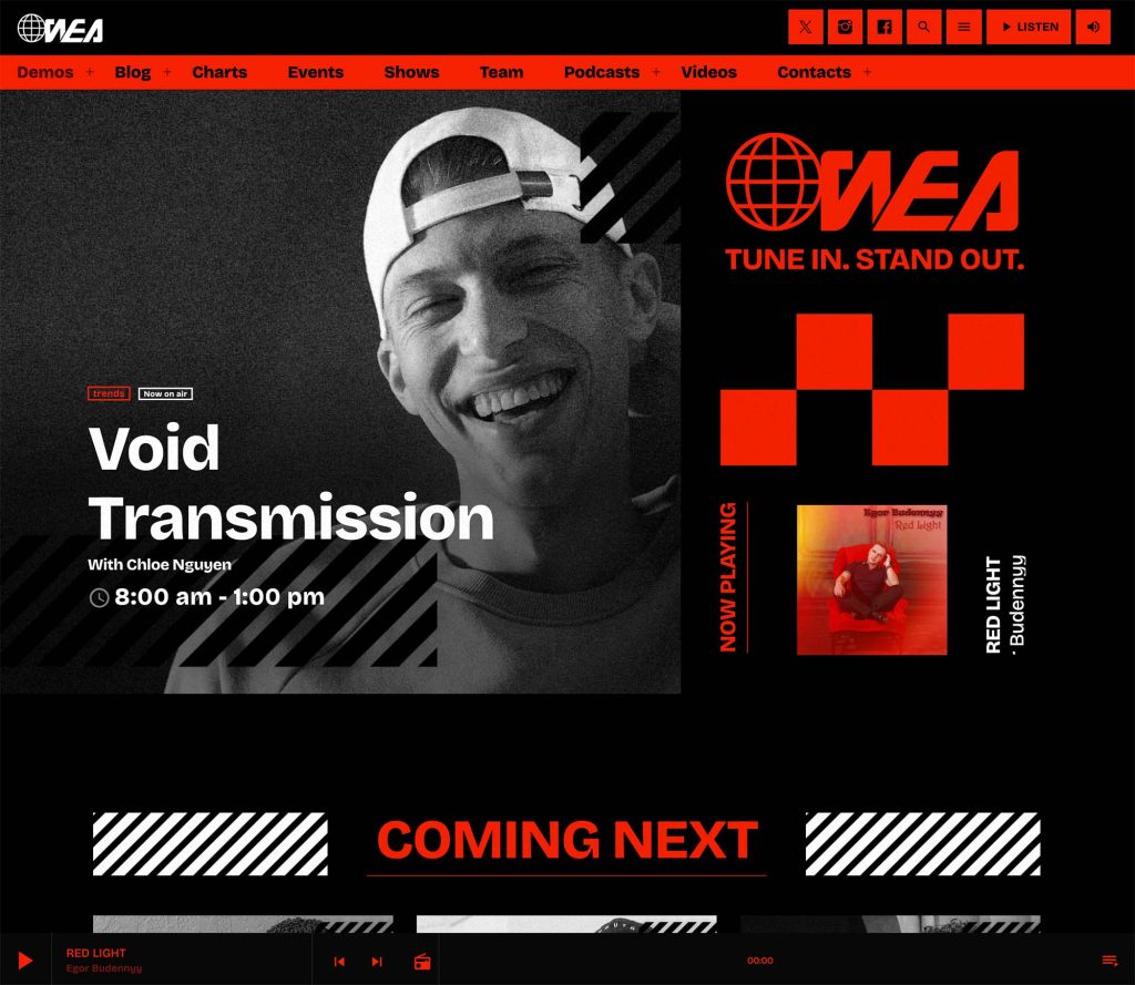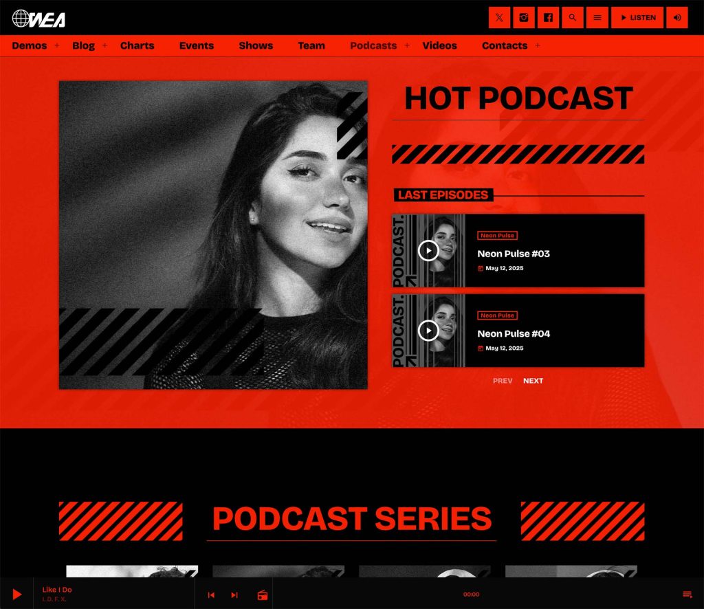 If your sound is raw, pulsating, and underground — your radio website should reflect it. WEA Radio is the definitive WordPress template for techno, house, EDM, and electronic music radio stations. Built with a brutalist design approach, powered by the Pro Radio WordPress Theme, and infused with a bold red and black visual identity, WEA Radio is more than a template — it’s a visual and functional extension of your station’s energy.