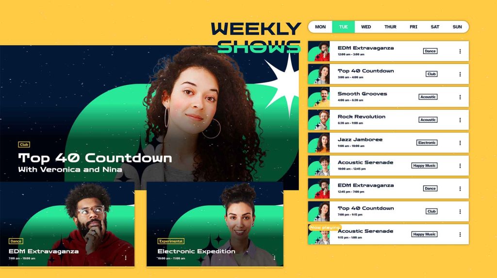 Presenter Profiles: Highlight your DJs, announcers, and hosts with custom profiles including bios, schedules, and show info.