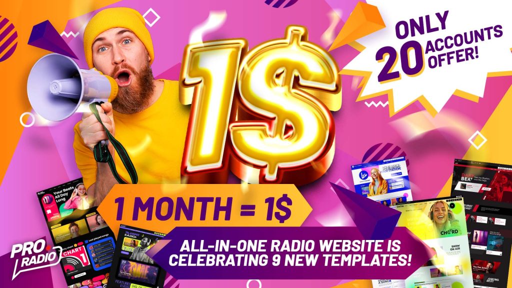 We’re celebrating our latest upgrade with 9 brand-new Radio Website Templates and a SUPER discount! Get your first month for ONLY 1$ on ANY of our packages, including Hosting + Pro Radio pre-installed! What is All-In-One Radio? https://www.youtube.com/watch?v=9Kv6M5Lo3vg   It’s a complete radio website solution: ✅ Professional Hosting optimized for radio streaming ✅ Pre-installed WordPress + Pro Radio ✅ Choose from 40 stunning radio website templates ✅ Easily edit colors, logo, music and contents VISUALLY! ✅ Live in just 60 seconds – No coding needed! ✅ Compatible with any streaming provider ✅ 3 Professional Email Accounts included! LIMITED OFFER – Only This Week! First 20 customers get the first month for just 1$ (renews at $19.99/month) Annual plan? Just $121 for a FULL YEAR (Hosting + Pro Radio license included!) Important: The discount is applied at checkout! Valid only for new […]