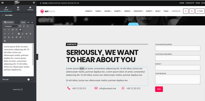 The theme demo contains a ready-made contacts page and the spare Section templates to add your contact section on any other page (Contact Form 7 plugin required).
