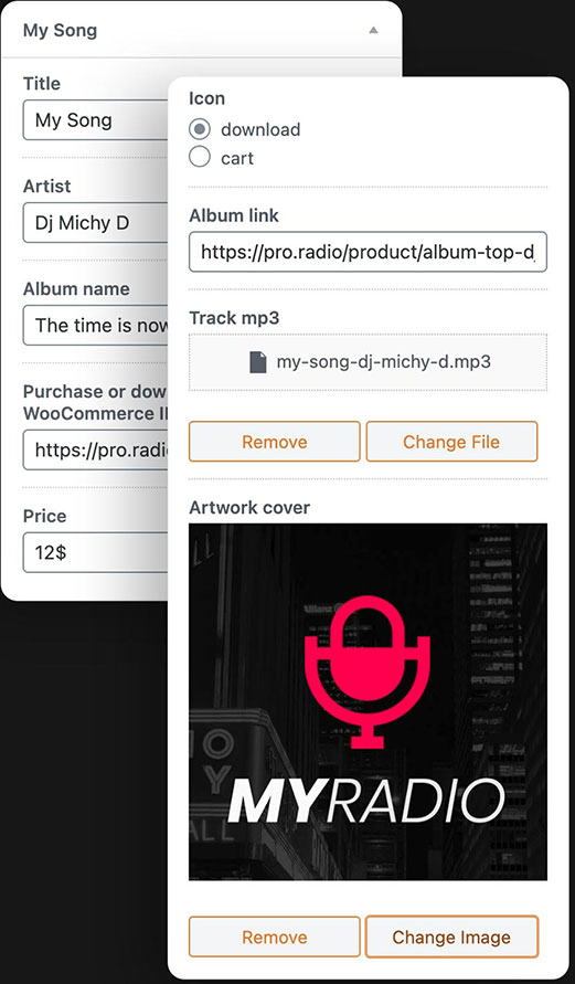 Add unlimited single tracks in the playlist, optionally add price, icon and purchase link, and upload your mp3 file.