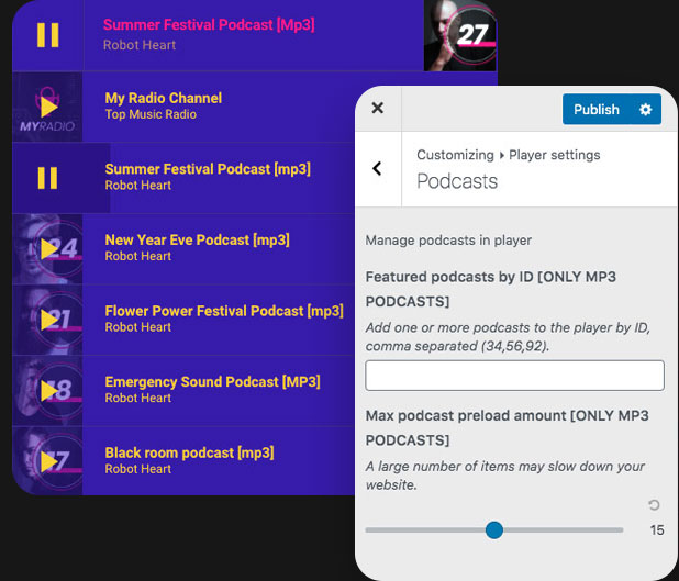 The custom post type “Radio Channels” allows to add an unlimited number of radio channels with any mp3 or aac source.
