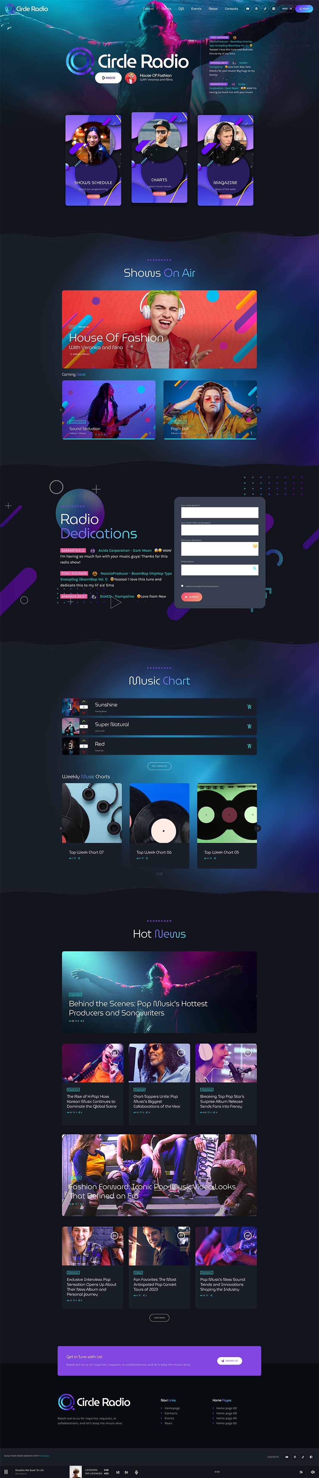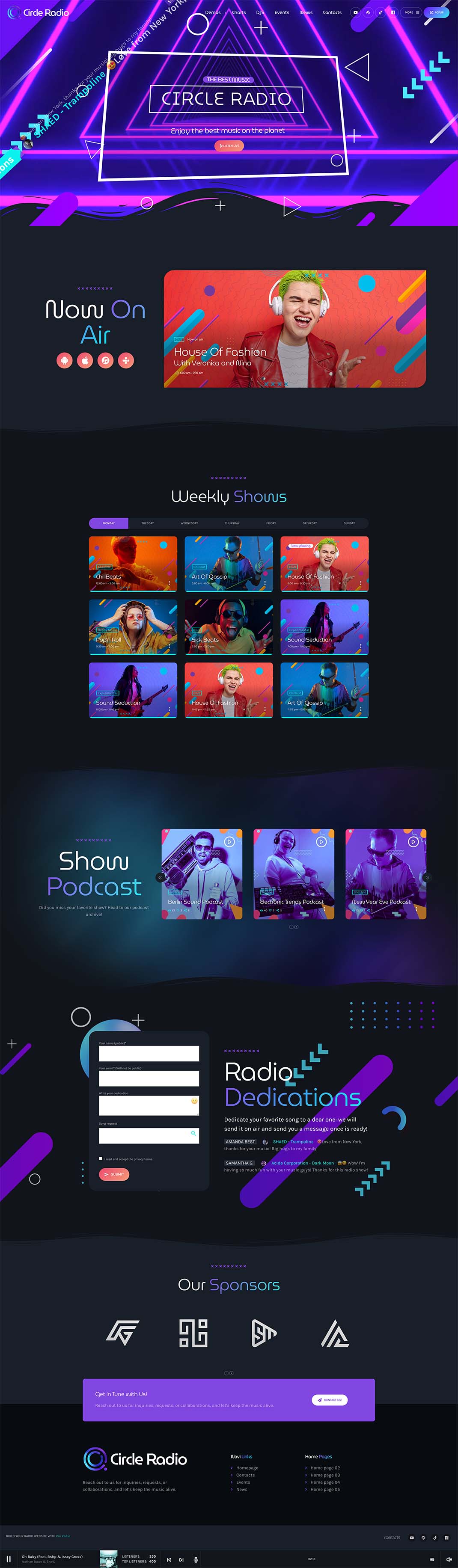 The first home page features a huge title with gradient captions, a now on air radio show section, a play button, and an upcoming radio shows carousel. It also includes a music chart with playable MP3 tracks, YouTube, or Spotify videos and music, and upcoming charts. Finally, it has a blog news section with a carousel of titles, highlights, and dedications, as well as a dedications form and a scrolling dedication list.
