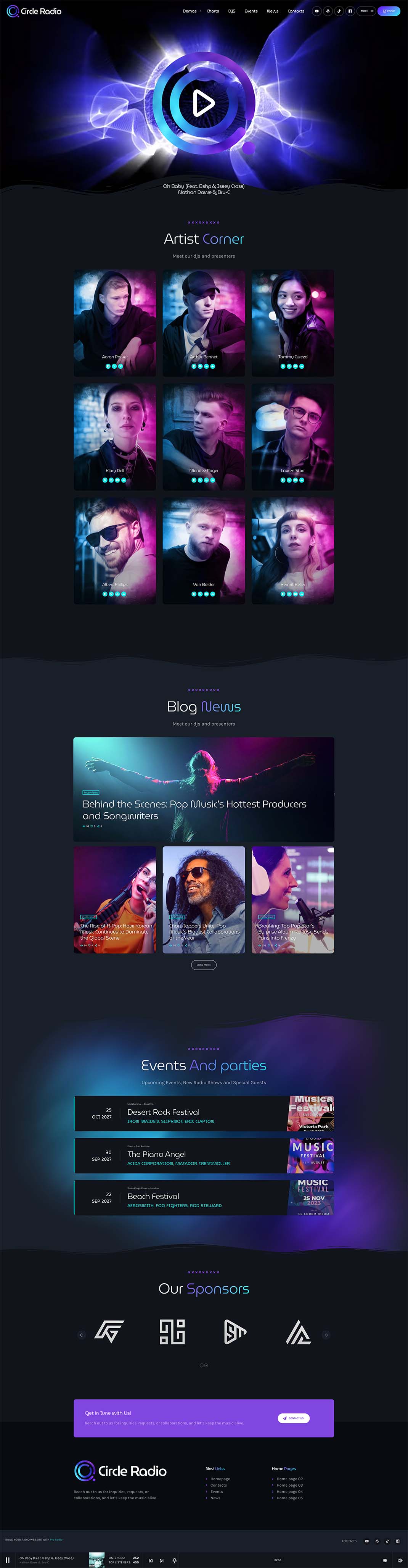 The third home page has a nice video background, an artist carousel or grid, a blog news section, events, and a sponsor carousel.