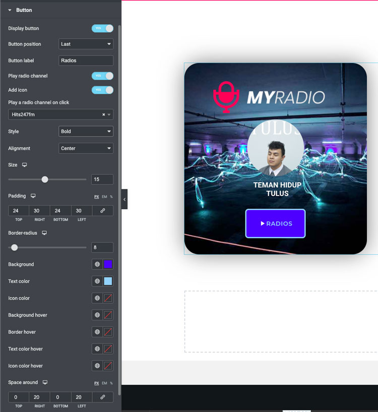 • Play button: a fully customizable button, any size, any background, any border, any alignment. Choose a radio or use the default channel. OR, if you want, link a popup of your choice or any external page!