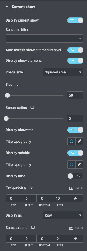 Extract and display the current radio show in the player, including thumbnail, title and schedule time, with custom tipography options, size, fonts, alignment and design settings.