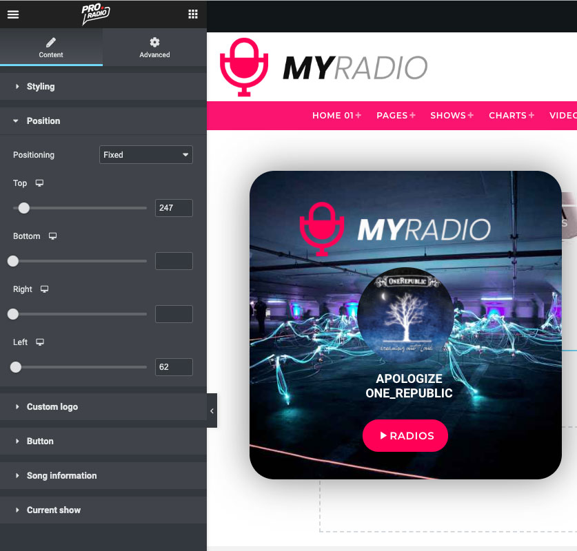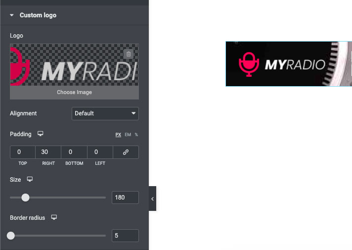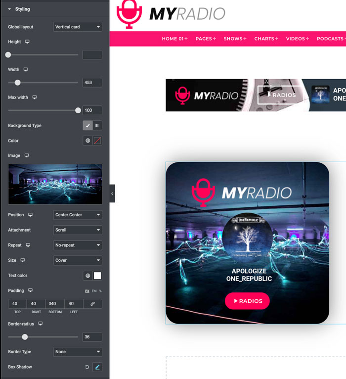 The new Custom Player Builder is a widget, included in the Pro Radio Elementor plugin from the next upcoming theme version, that allows to build from scratch any design for your radio station player, fit any page layout, override the default player bars and popup, any background, any size, any functionality, song titles and more.