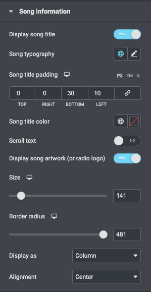 Since the Pro Radio WordPress Theme can display the song titles from any popular radio provider, you can also add this information in the custom player, and include the information and song artwork in your design. Choose the general design layout, tipography opitons as font size, paddings and artwork design (size, radius, positioning).
