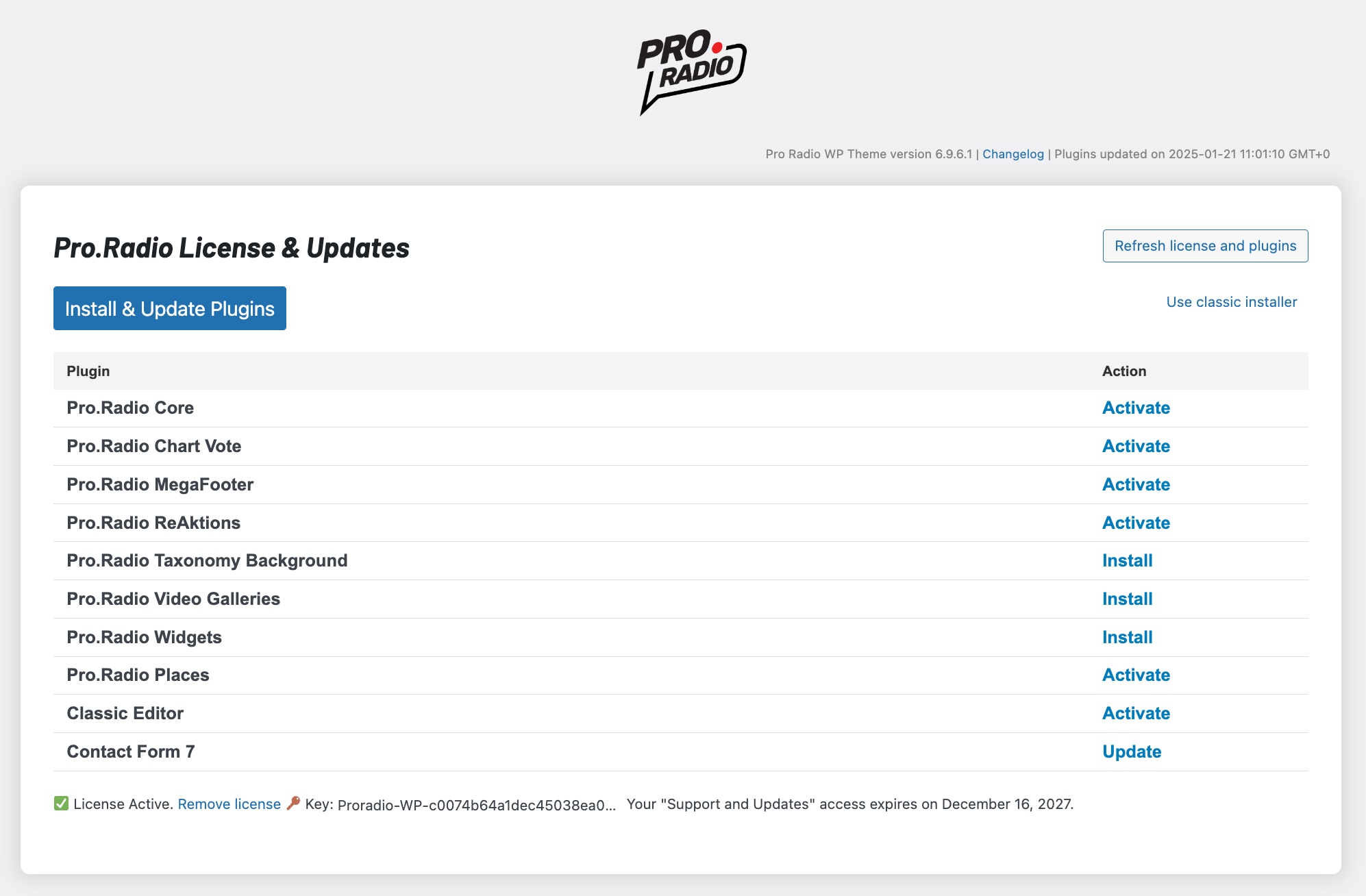 We’ve completely overhauled the Pro Radio Admin interface! The new design is clearer and more user-friendly, making plugin installation and updates seamless and automated. With just one click, you can install or update all plugins, saving you time and effort. Plus, we’ve ensured that plugin updates are always visible, preventing issues caused by outdated plugins.