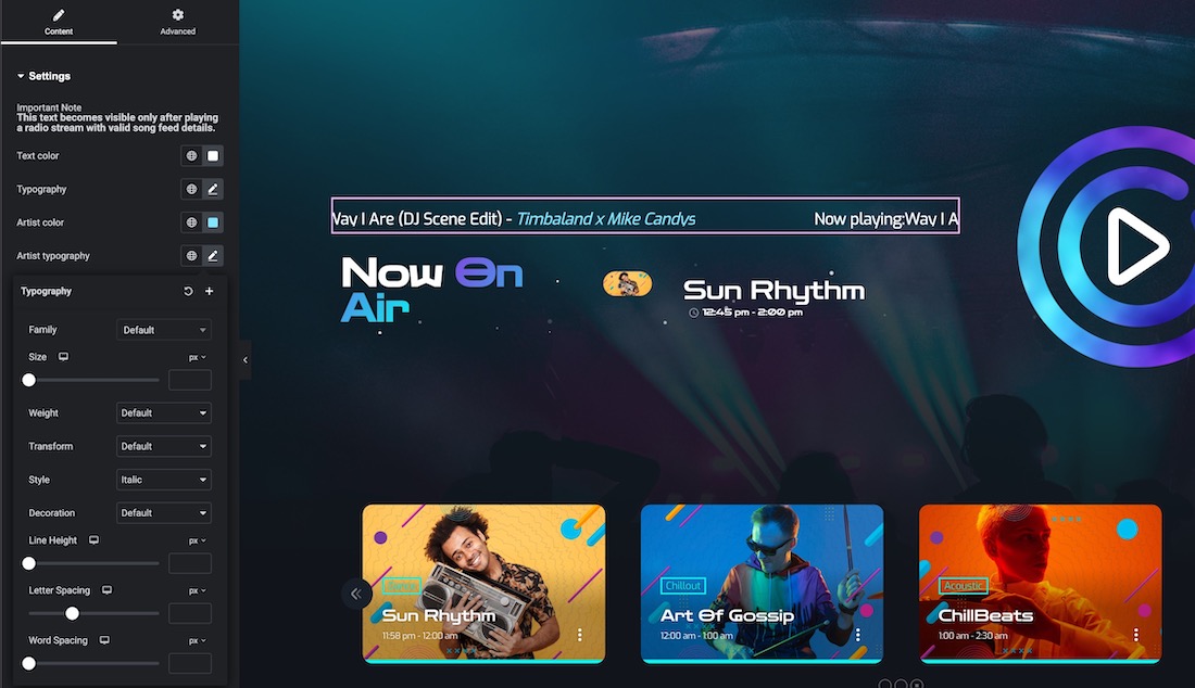 With Pro Radio WordPress Theme there are over 40 custom Elementor widgets for radio stations. One of them is the Titles Feed, a widget able to display the current song title taken from your stream, directly on your page.