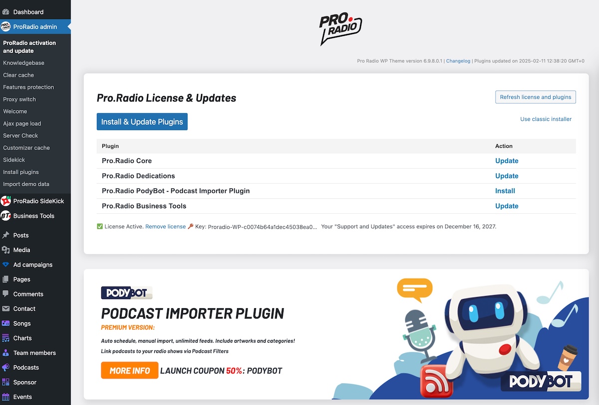 The new ProRadio Admin dashboard now includes an upgraded plugin installation interface able to detect automatically theme updates and new installations, offering a 1-click solution to quickly upgrade or install from scratch any plugin you need!