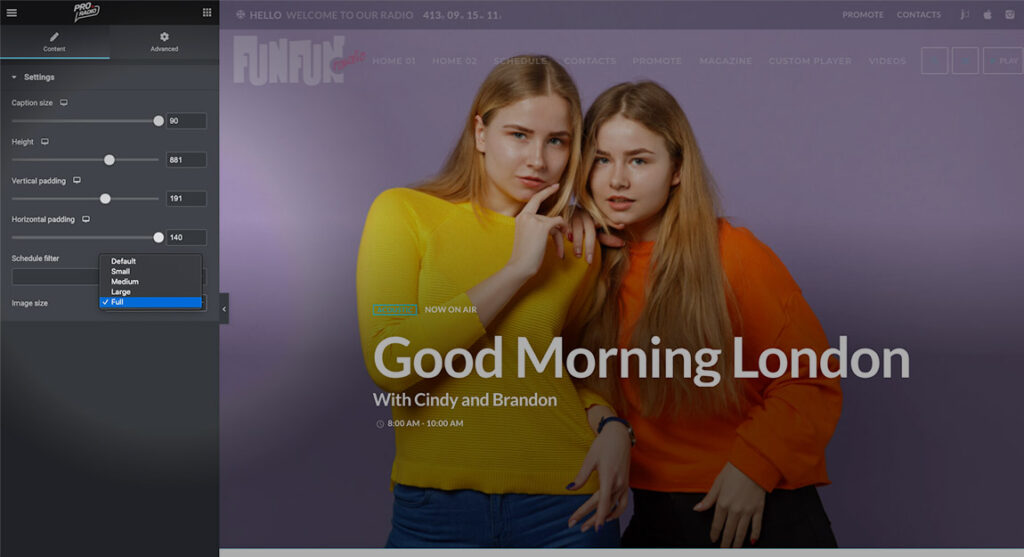 We added a dropdown to choose the image size on the widgets “On Air Show” and “Upcoming Shows Slider”: this will allow to chose the large of the Full resolution for your background iamges, and achieve a better result depending on how you place the widget on your apge using Elementor. If used in full-screen, the option “full” will load the best resolution possible, for a sharplooking show image, while if used in a boxed design, you can choose “Large”, achieving a faster loading time for the page.