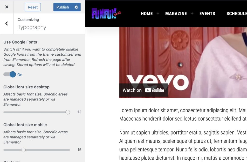 In the Typography section it’s not available a control to change the default font size for Desktop and Mobile.