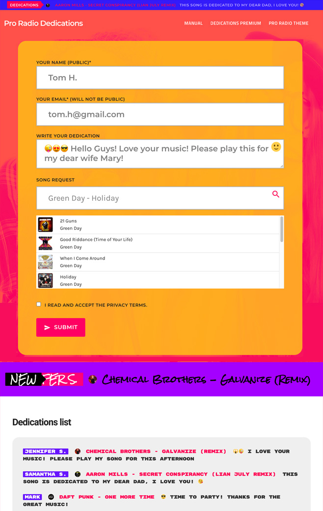 Enable a mandatary email field in the form and automatically notify your visitor when a dedication is approved. This will make your listeners happy, and create an instant returning visitor on your website.