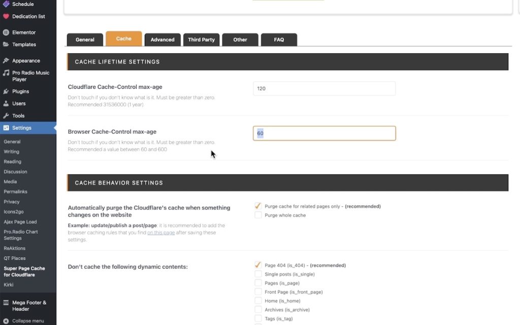 Reload and the website is going to open fine. Once done, we need to go to plugins and search for “Super Page Cache for Cloudflare”. This plugin allows to set the proper caching parameters for a radio station website. Install and activate this plugin and now we are going to link it to our Cloudflare account. So, go to the dashboard and you will see a new item on the top menu. Go to Cloudflare, click on “My Profile” and “API Tokens”. Use the global API key and paste it in the Cloudflare API key space. Compile your email, you can leave log disabled, and save. Once done, in the cache tab, set to 120 and 10 seconds, then make sure to enable the purge cache and add these entries in the “Prevent the following URLs to be cached”: admin. PHP with wildcard, then wildcard nox, wildcard nocache, and wildcard QT proxy URL. Leave all of the other options on default. Then in the “Other” tab, you can optionally enable “Auto Prefetch URLs on Mouse Hover”. Once done, save. Enable page caching. We run again the test so the performance will improve noticeably. If you leave Cloudflare working for about 24 hours. But if we run the test again straight away, we can see that the start render time is already about the half and the first content full paint is already the half. So from 4 seconds, we are at 2.6 seconds. Thank you for watching and see you on the next video.