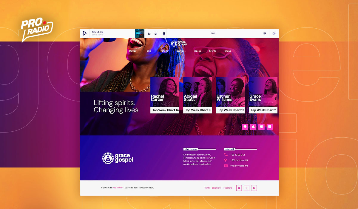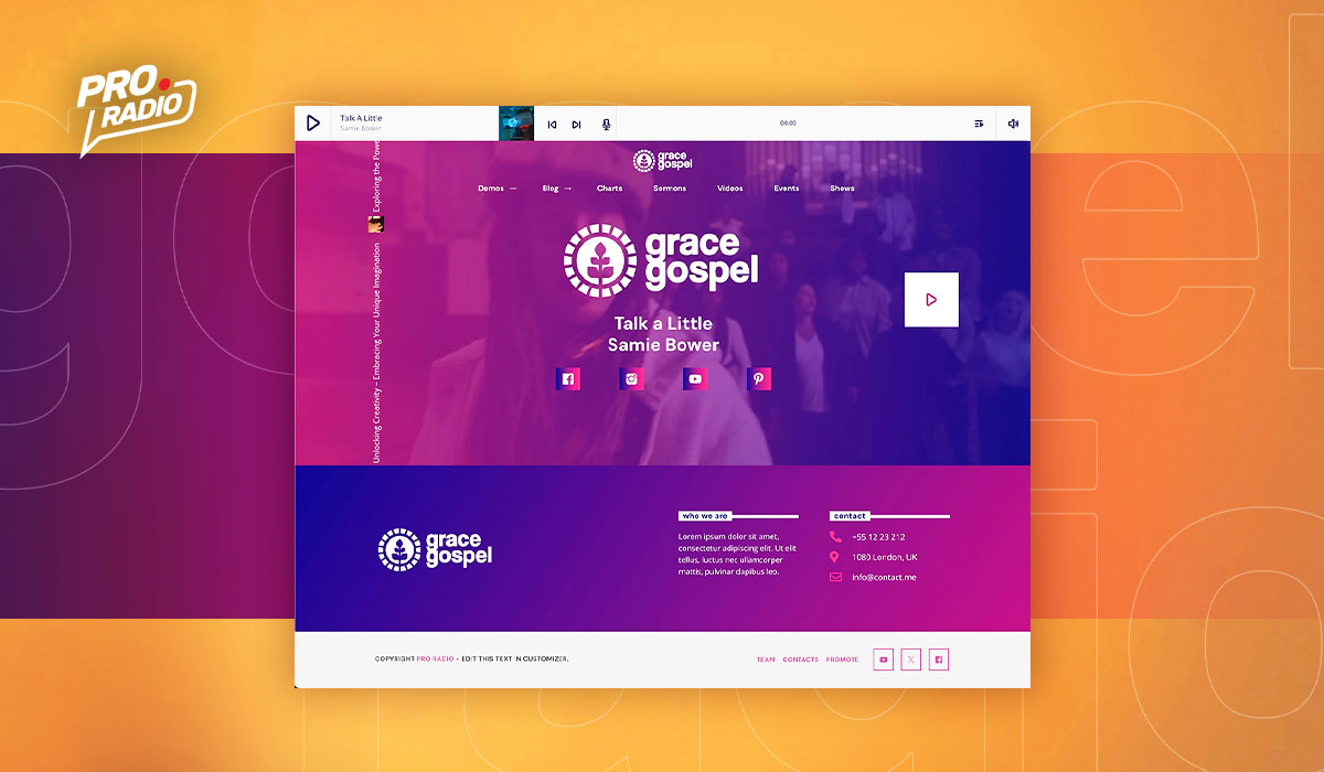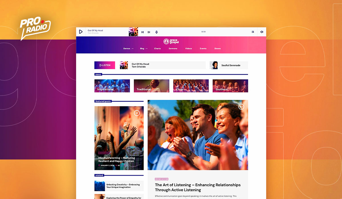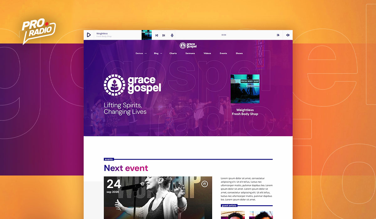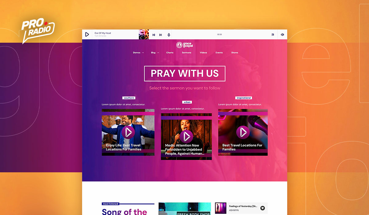 Gospel Grace is more than just a beautiful design, though. Built on the powerful Pro.Radio WordPress Theme, this template equips you with all the features you need to share your message of hope. Integrate artists and choir profiles seamlessly, create detailed show schedules, and upload sermons, all while keeping your listeners engaged.