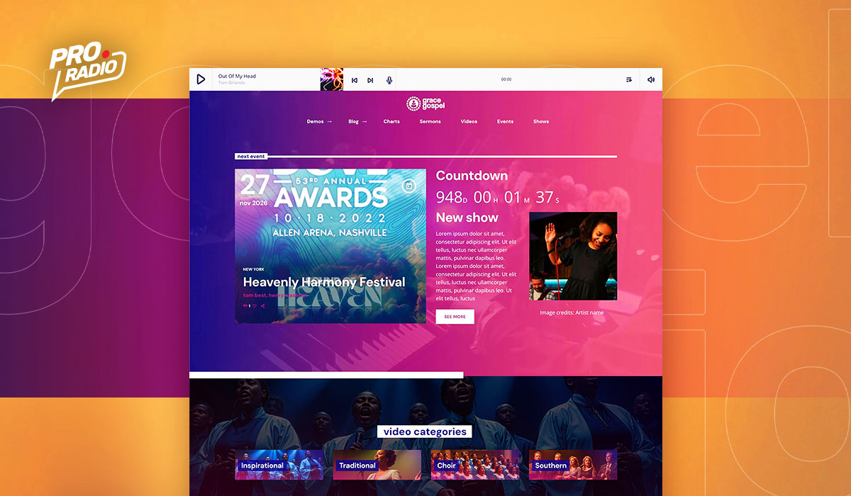 Meet our new Pro Radio Gospel Grace Demo Template : a radio website experience that uplifts spirits like your favorite hymns. The design features a clean and modern aesthetic, bathed in warm, hopeful light. This design reflects the promise of a brighter future, a core theme in Gospel music.
