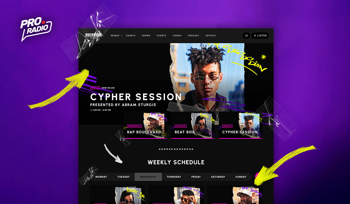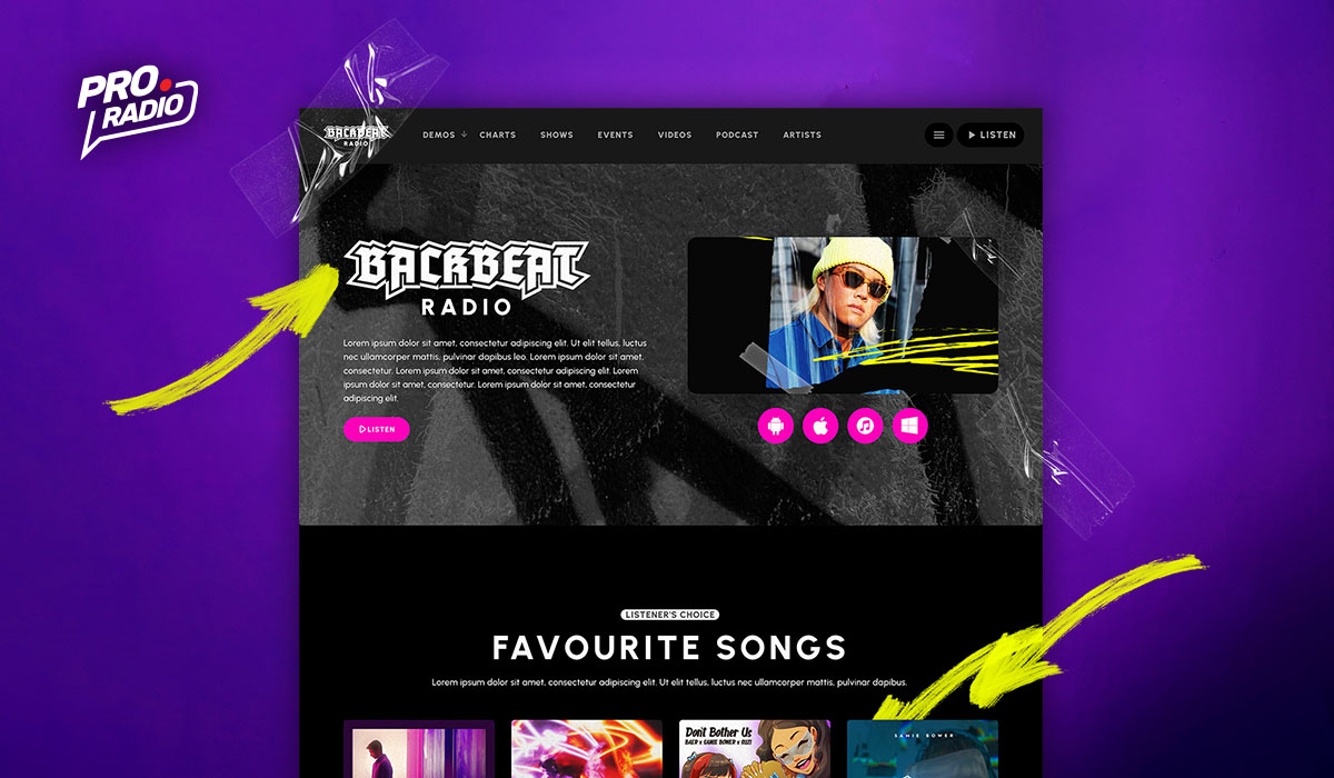 BackBeat Radio boasts a design that seamlessly blends captivating visuals with the electrifying energy of hip-hop. Imagine your listeners feeling instantly connected to the underground scene the moment they land on your site. Graffiti art explodes across the screen, creating a dynamic and immersive experience. The website becomes more than just a platform; it becomes a visual representation of the music itself.